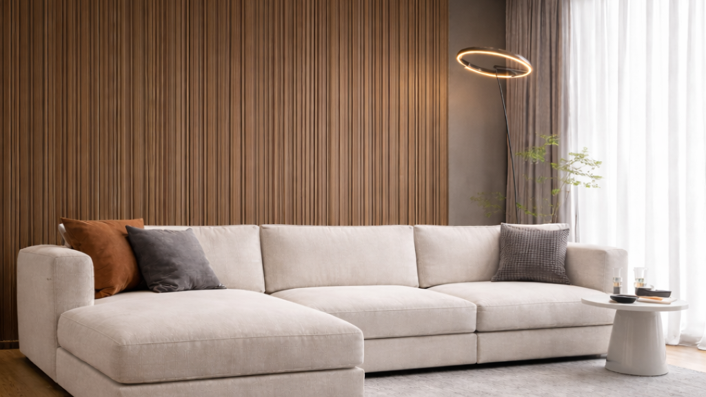 Este tipo de lambrín es muy popular para muros de TV o paredes principales, ya que aporta elegancia y modernidad sin necesidad de realizar grandes remodelaciones.
